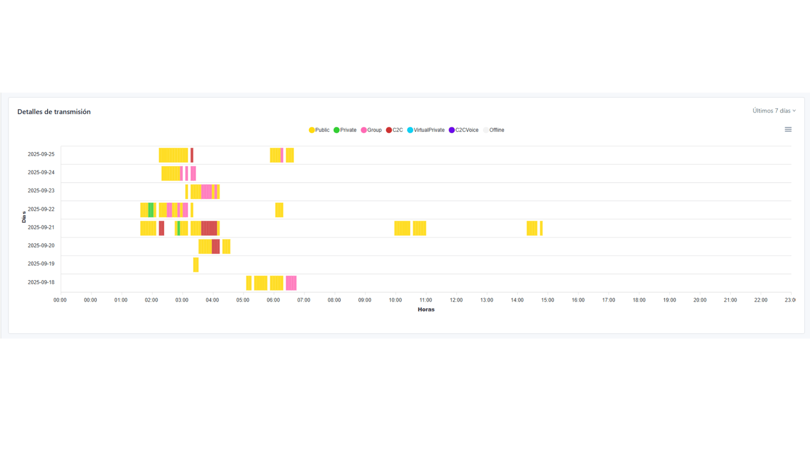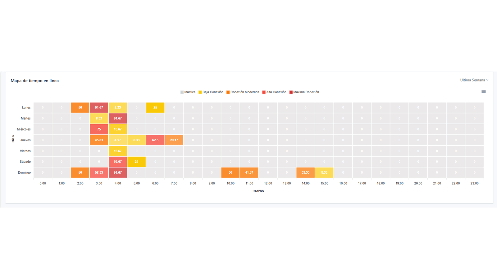 Este gráfico, en forma de mapa de calor, utiliza colores para mostrar la intensidad de tu conexión a lo largo de los días y horas: